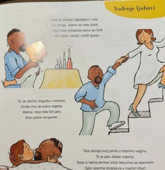 Tata stavlja svoj penis u maminu vaginu. To je jako dobar osjećaj. Tada iz tatinog penisa izlazi tekućina sa spermom. Tako sperma dospijeva u mamin trbuh – piše u slikovnici ‘Odakle dolaze bebe’. ili citat iz druge: Igranje svojim pišom nešto je što možeš raditi kad si sam. U svojoj sobi, na primjer! Iza hrvatskih izdanja stoji izdavačka kuća Forum iz Zadra.